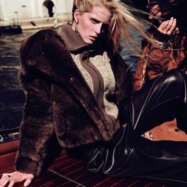 The Autumn-Winter 2025 collection plays on superimpositions and contrasting materials. Ba&sh relies on deep velvet, brown leather, mocha suede, and light chiffon. The wardrobe mixes structured tailoring and maximal layering, combining faux fur and soft denim. This approach aims to meet the needs of “women on the move,” according to the brand’s philosophy.