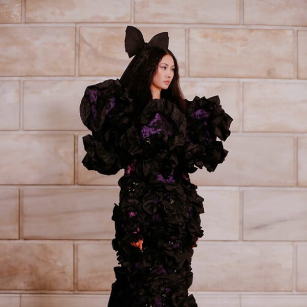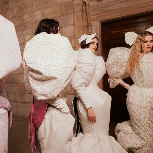 But, instead of cartoonish, his reference was neo-19th century, made up of Victorian-inspired vampy gowns, cut with leg-of-mutton sleeves, inflated bustiers, and sweeping trains stamped by enormous bows.