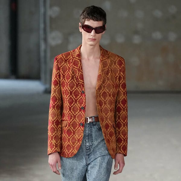 A series of superb jacquard sweaters closed the show with soothing bucolic images, while in the final looks jackets and coats reproduced tapestry-like views of Venice and Florence.