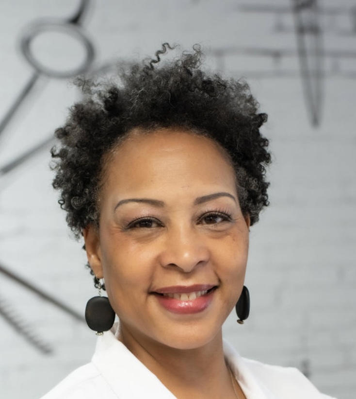 Mika smith- A smiling woman wearing a black 'HairLoom' t-shirt and a stylish fedora hat, posing confidently in a well-lit salon environment.